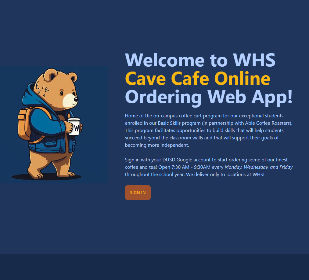 Warren High School's Cave Cafe coffee ordering web application. Staff at WHS use this app to order cafe style drinks to support our Special Education program. Full-Stack with user authentication for DUSD employees.