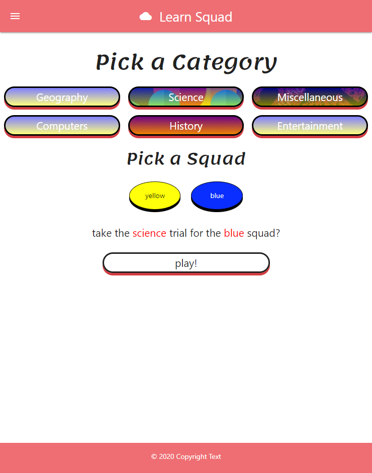 A fast paced trivia game. Pick a squad, and take a quiz from 6 different categories. Earn enough 'cash', and you will be able to color your territory on a grid map in the name of your squad! Uses a public 'Jeopardy!' data set.