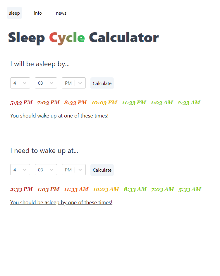 A handy sleep cycle calculator. Figure out when you should sleep and wake up. Slightly educational. Scrapes the web for any recent news articles about sleep cycles.